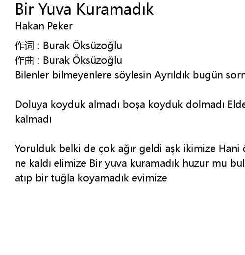 | Yorulduk belki de ok a r geldi a k ikimize Hani zgü rdü k hani mutluyduk ne kald elimize Bir yuva kuramad k huzur mu bulamad k B rak onu bir temel at p bir tu la koyamad k evimize |