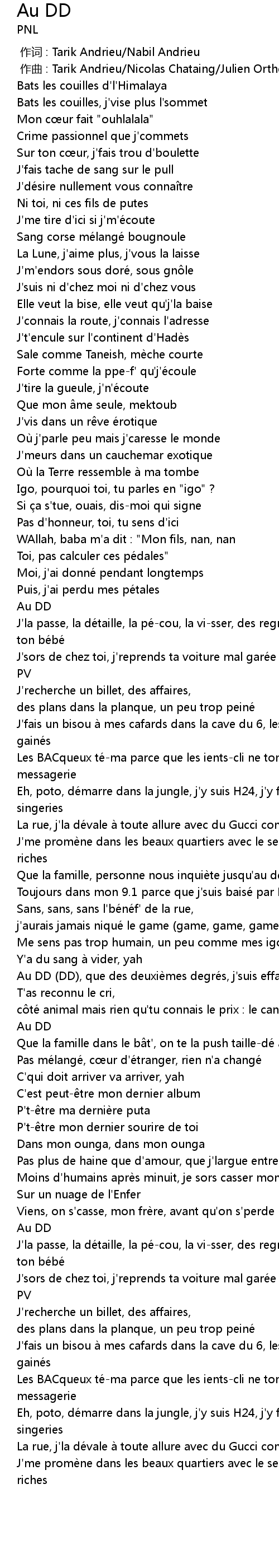 | [03:37.65] | J'me promène dans les beaux quartiers avec le seum qui fait peur aux riches |