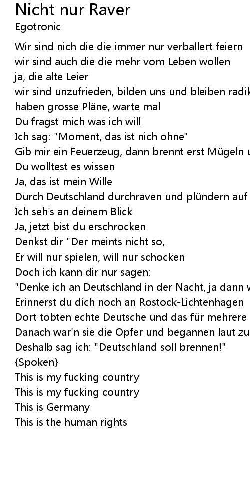 | "Denke ich an Deutschland in der Nacht, ja dann will ich das es kracht!" | |