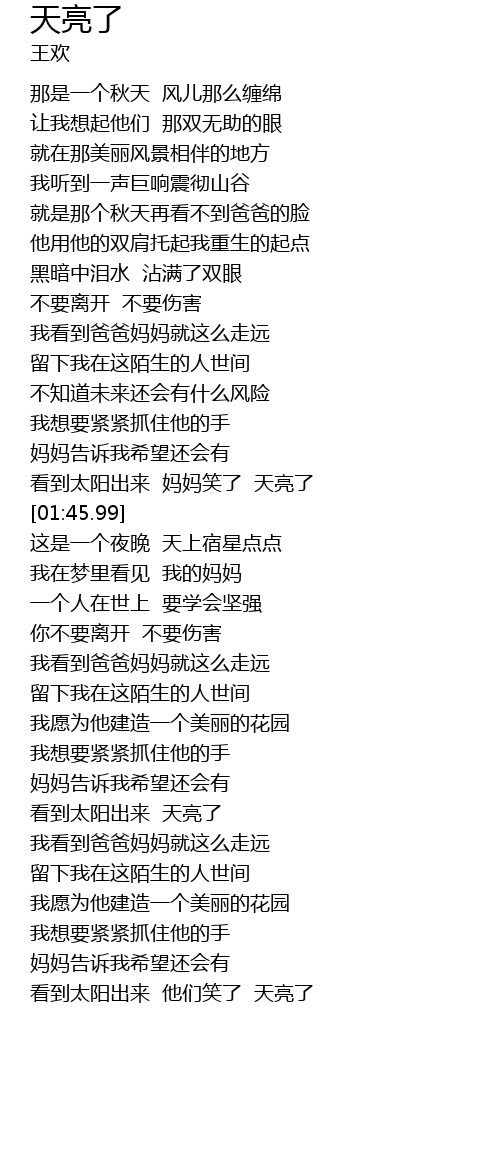 | [01:35.44] | 看到太阳出来 妈妈笑了 天亮了 |