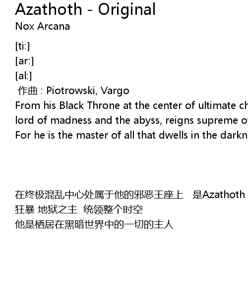 | [00:07.48] | From his Black Throne at the center of ultimate chaos, Azathoth, the lord of madness and the abyss, reigns supreme over all time and space. |