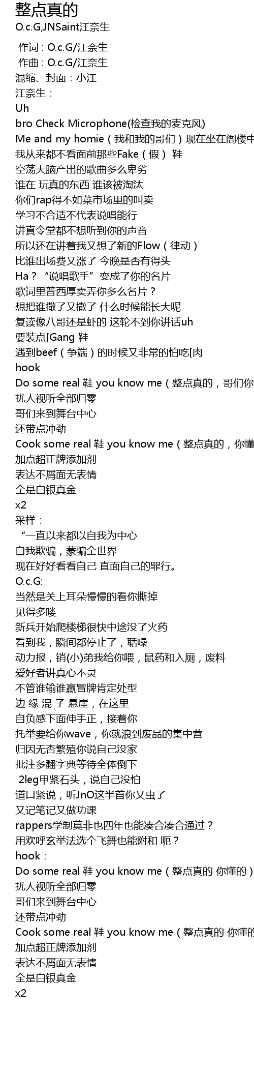 | [01:03.905] | Do some real xié you know me zhěng diǎn zhēn de, gē men nǐ dǒng de |