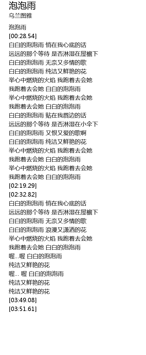 | [00:50.18] | 白白的泡泡雨 纯洁又鲜艳的花 |