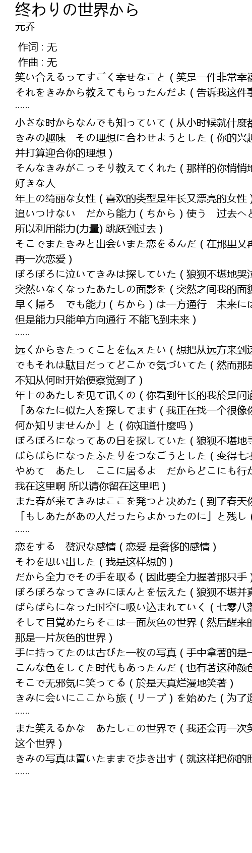 | [04:27.30]きみに会いにここから旅(リープ)を始めた(为了遇到你从现在开始旅行了) [04:37.21] | ······ |