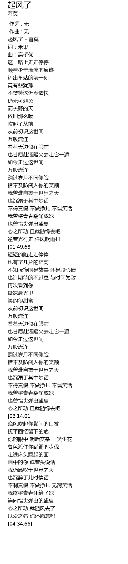 | [00:00.399] | 起风了 - 莙莫 |