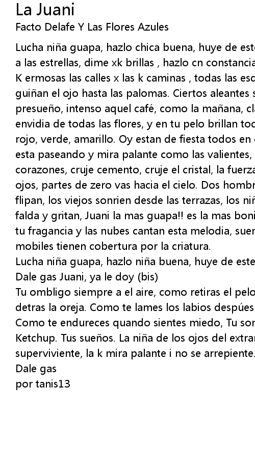 | K ermosas las calles x las k caminas , todas las esquinas de ti se enamoran, te gui an el ojo hasta las palomas. Ciertos aleantes solo para amarte, dulce presue o, intenso aquel cafe, como la ma ana, clara es tu mirada, todo mas la envidia de todas las flores, y en tu pelo brillan todos los colores blanco, rojo, verde, amarillo. Oy estan de fiesta todos en el barrio, la ni a morena esta paseando y mira palante como las valientes, suenan campanas, laten corazones, cruje cemento, cruje el cristal, la fuerza del pu o brilla en tus ojos, partes de zero vas hacia el cielo. Dos hombre se giran, los jovenes flipan, los viejos sonrien desde las terrazas, los ni os te agarran por la falda y gritan, Juani la mas guapa!! es la mas bonita!! el aire se aparta ante tu fragancia y las nubes cantan esta melodia, suenan los tambores y todos los mobiles tienen cobertura por la criatura. | |