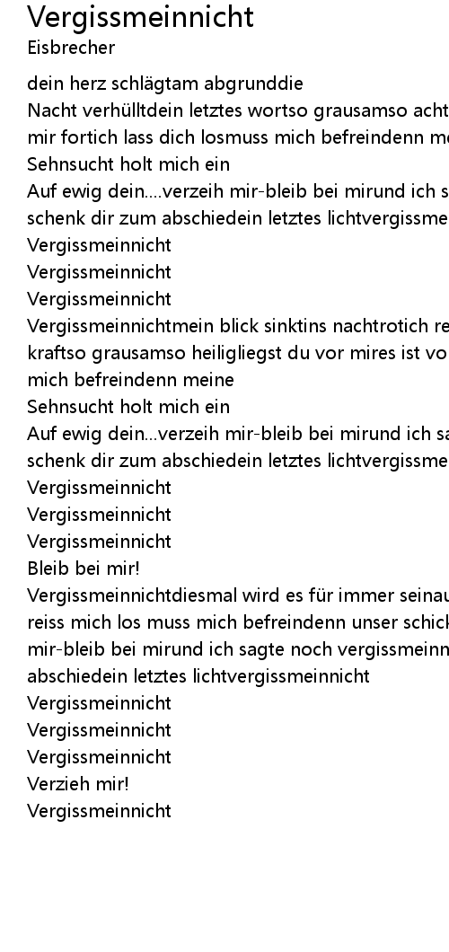 | Vergissmeinnichtdiesmal wird es fü r immer seinauch diese wunde wird verheilnich reiss mich los muss mich befreindenn unser schicksal holt uns einverzeih mirbleib bei mirund ich sagte noch vergissmeinnichtich schenk dir zum abschiedein letztes lichtvergissmeinnicht | |