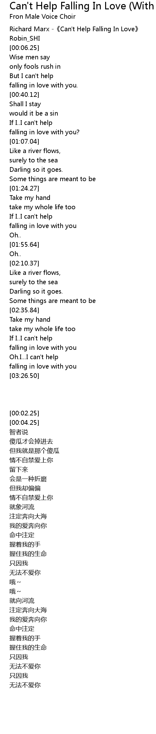 | [00:02.25] | Richard Marx Can' t Help Falling In Love |