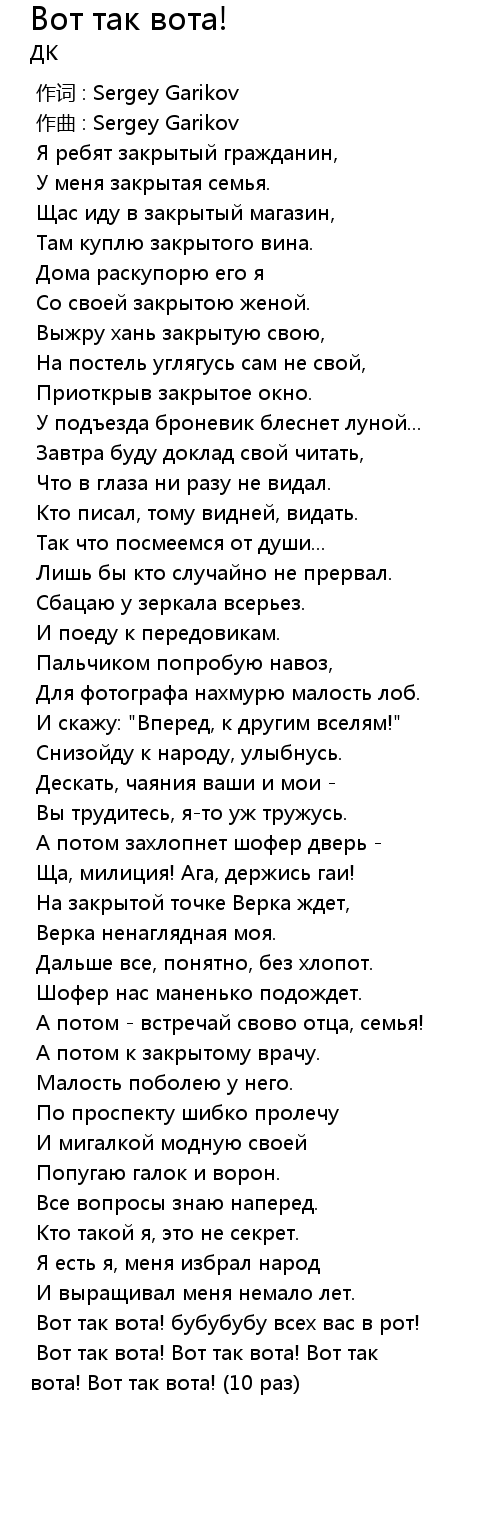 Вот так вота! Вот так вота! Вот так вота! Вот так вота! (10 раз) |