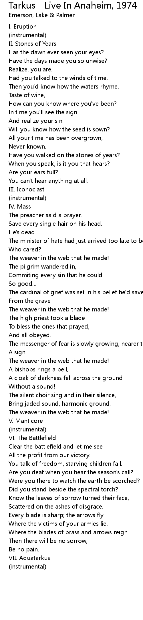 Tarkus - Live In Anaheim, 1974 Lyrics
