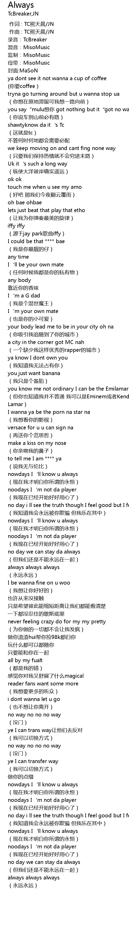 | [00:00.000] | 作词 : TC熊天晨/JN |