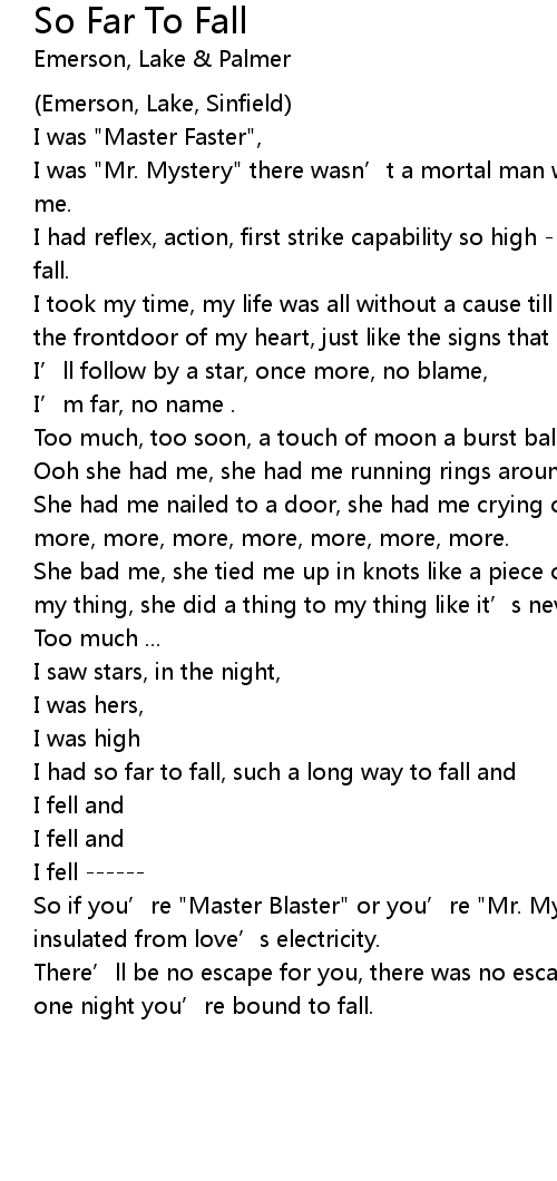 | Too much, too soon, a touch of moon a burst balloon, so far, so far to fall. | |