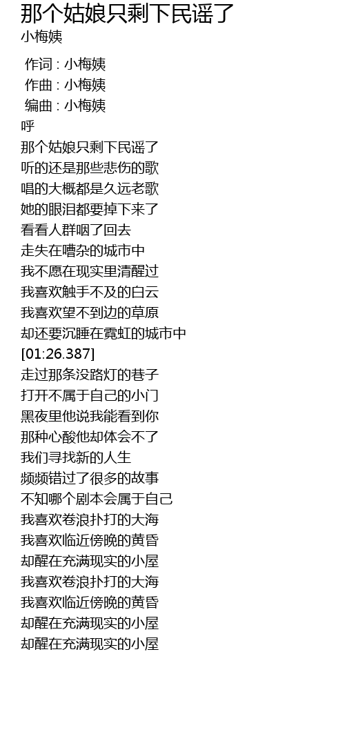 | [00:18.906] | 那个姑娘只剩下民谣了 |