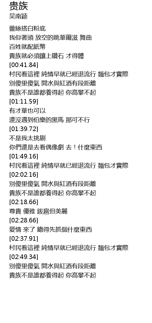 | [02:56.91] | 貴族不是誰都養得起 你高攀不起 |