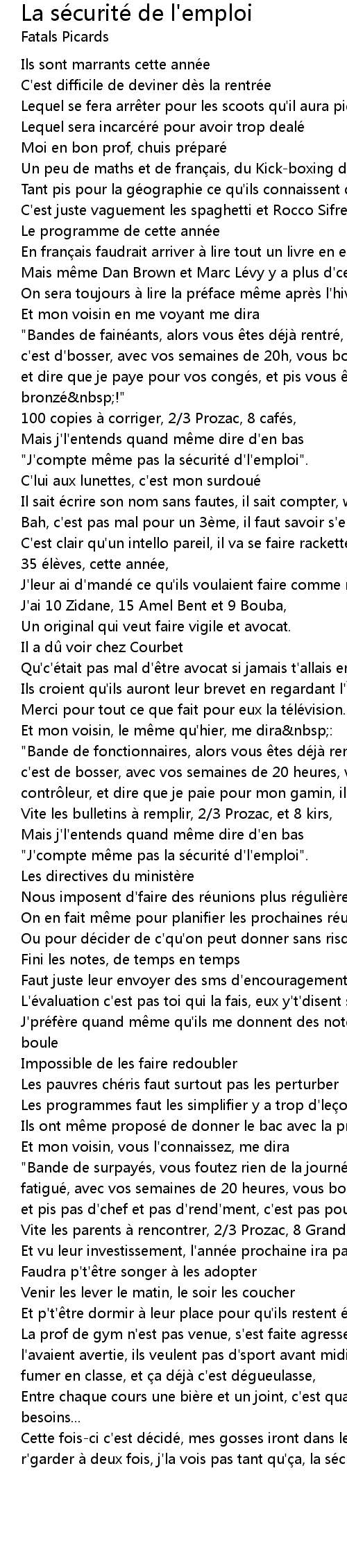 | "Bande de surpayés, vous foutez rien de la journée, vous devez pas être fatigué, avec vos semaines de 20 heures, vous bossez bien moins qu'un chômeur, et pis pas d'chef et pas d'rend'ment, c'est pas pour c'que vous faites vraiment" | |