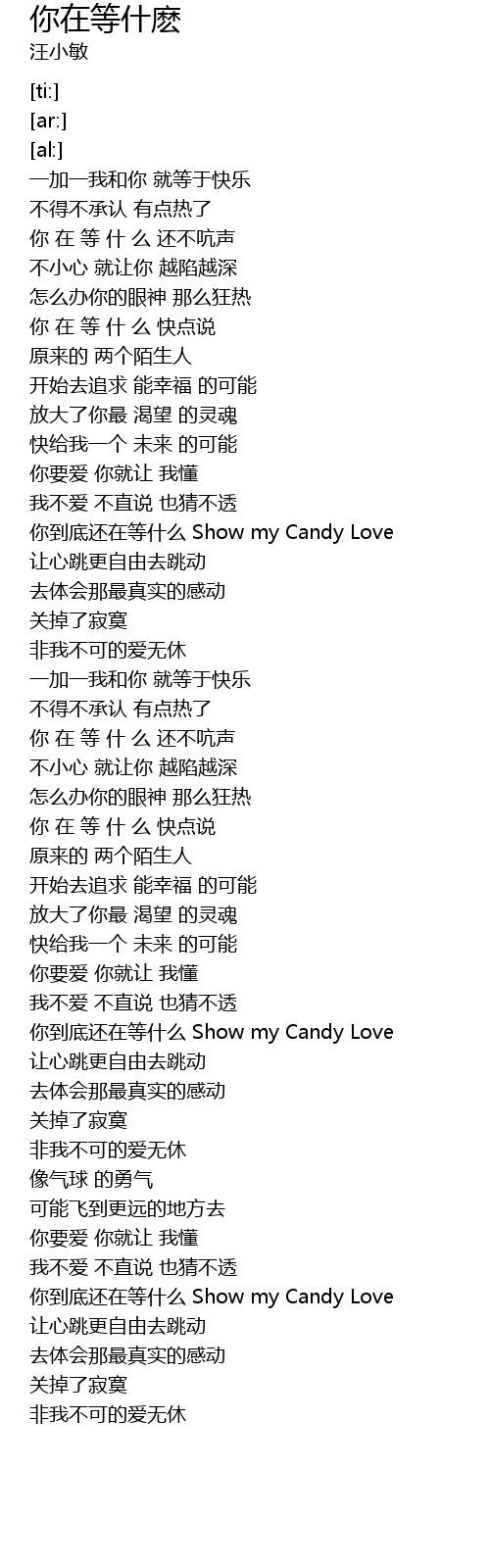 | [01:05.58] | ni dao di hai zai deng shen me Show my Candy Love |