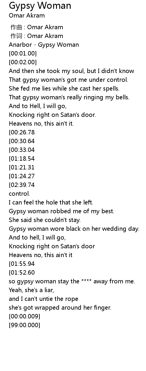 | [00:07.93] | That gypsy woman' s got me under control. |