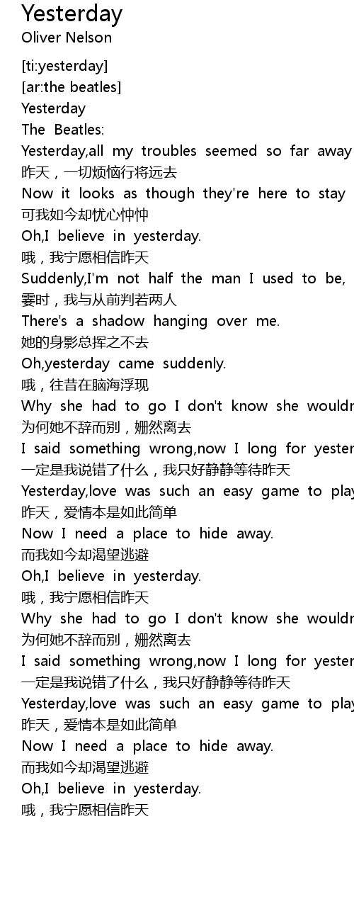 | [00:34.567] | Oh, yesterday came suddenly. |