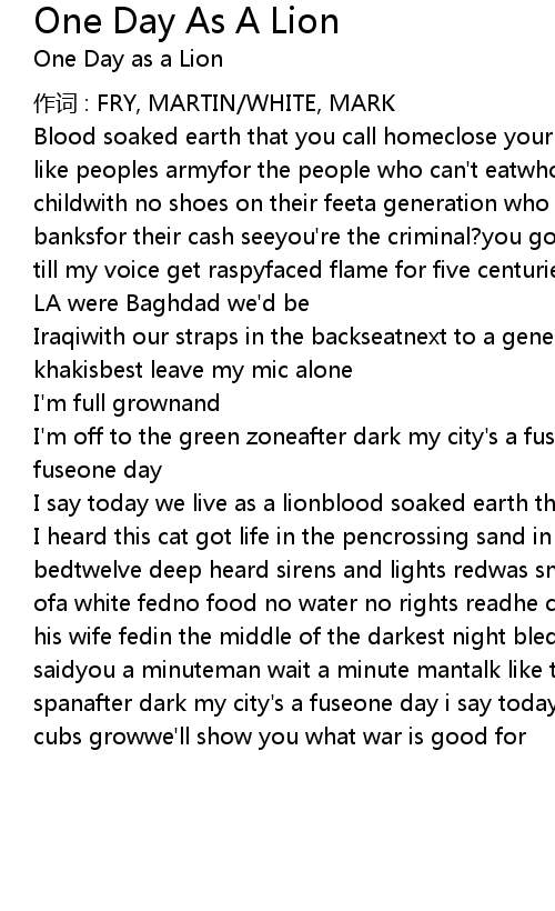 | I heard this cat got life in the pencrossing sand in the back of a truck bedtwelve deep heard sirens and lights redwas smacked on his dome with the club ofa white fedno food no water no rights readhe came north to keep his seedsand his wife fedin the middle of the darkest night bledstepped to the law and saidyou a minuteman wait a minute mantalk like that might limit your life spanafter dark my city' s a fuseone day i say today we live as a lionand when our cubs growwe' ll show you what war is good for |