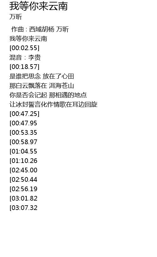 | [03:09.10][02:45.00][02:20.93][01:10.50] | wo deng ni lai yun nan qu chuan yue yu long xue shan |