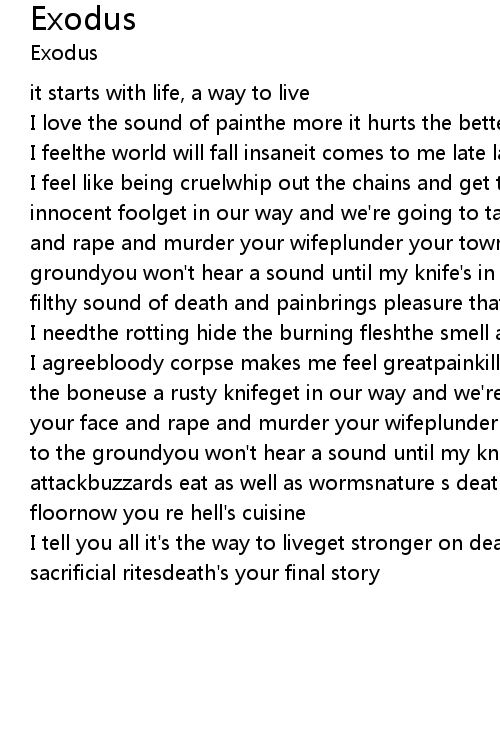 I feel like being cruelwhip out the chains and get the knifeand slay some innocent foolget in our way and we're going to take your lifekick in your face and rape and murder your wifeplunder your town your homes they'll burn to the groundyou won't hear a sound until my knife's in your backthe exodus attackthe filthy sound of death and painbrings pleasure that |