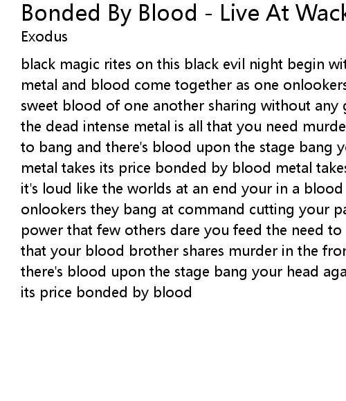 black magic rites on this black evil night begin with the slice of the blade metal and blood come together as one onlookers they gasp in dismay taste the sweet blood of one another sharing without any greed bang you head as if up from the dead intense metal is all that you need murder in the front row crowd begins to bang and there's blood upon the stage bang you head against the stage and metal takes its price bonded by blood metal takes hold death starts to unfold it's loud like the worlds at an end your in a blood fury the metal won't stop onlookers they bang at command cutting your palm and drinking your blood the power that few others dare you feed the need to go out and kill the same need that your blood brother shares murder in the front row crowd begins to bang and there's blood upon the stage bang your head against the stage and metal takes its price bonded by blood |