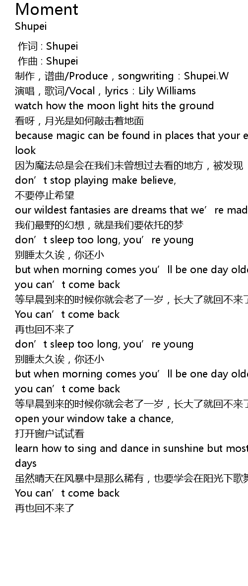 | [00:08.729] | yǎn chàng, gē cí Vocal, lyrics: Lily Williams |