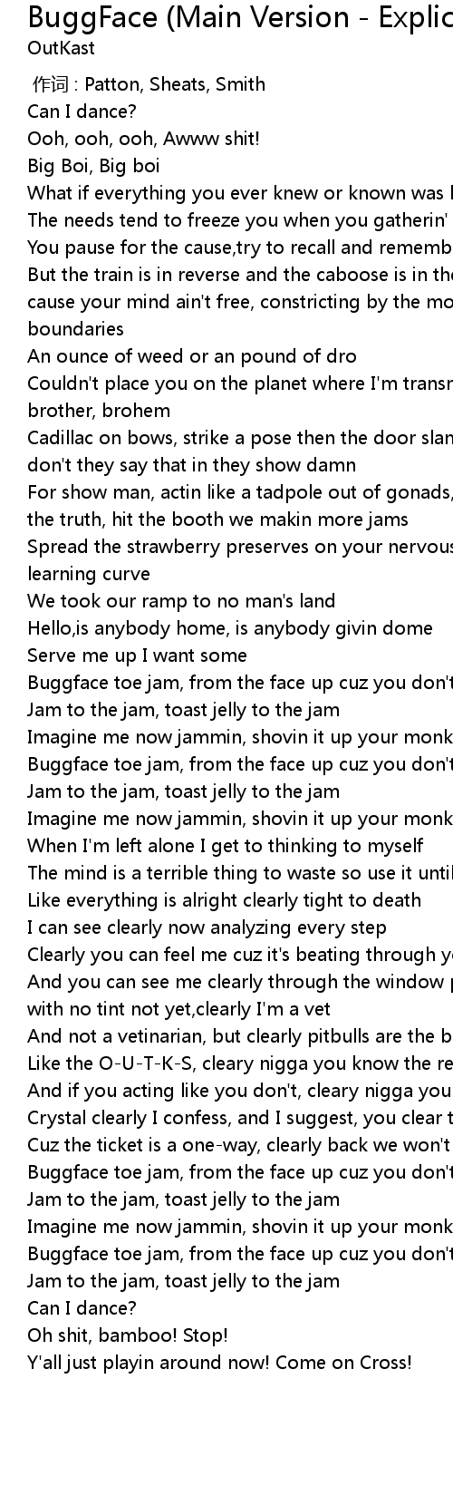 | [00:57.81] | Buggface toe jam, from the face up cuz you don't give a jam |