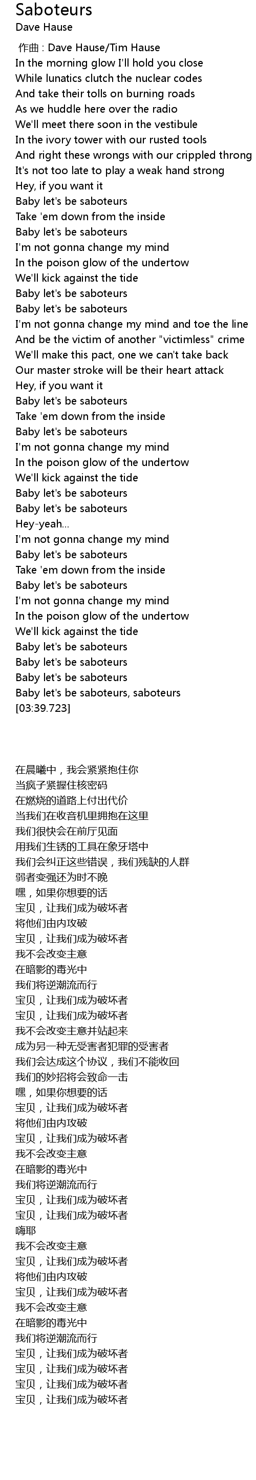 | [03:25.962] | Baby let' s be saboteurs |