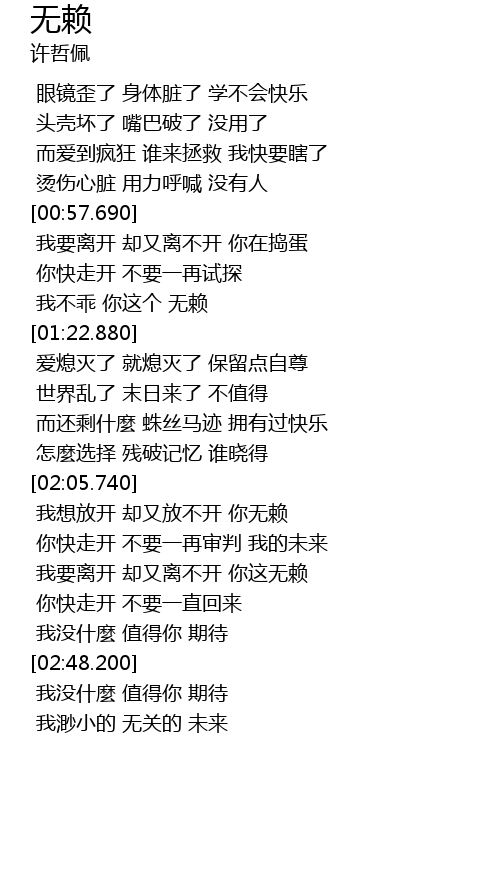 | [02:25.210] | 我要离开 却又离不开 你这无赖 |
