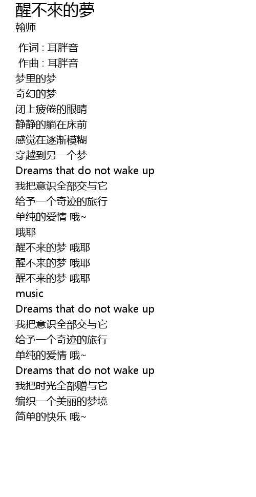| [01:02.286] | 醒不来的梦 哦耶 |