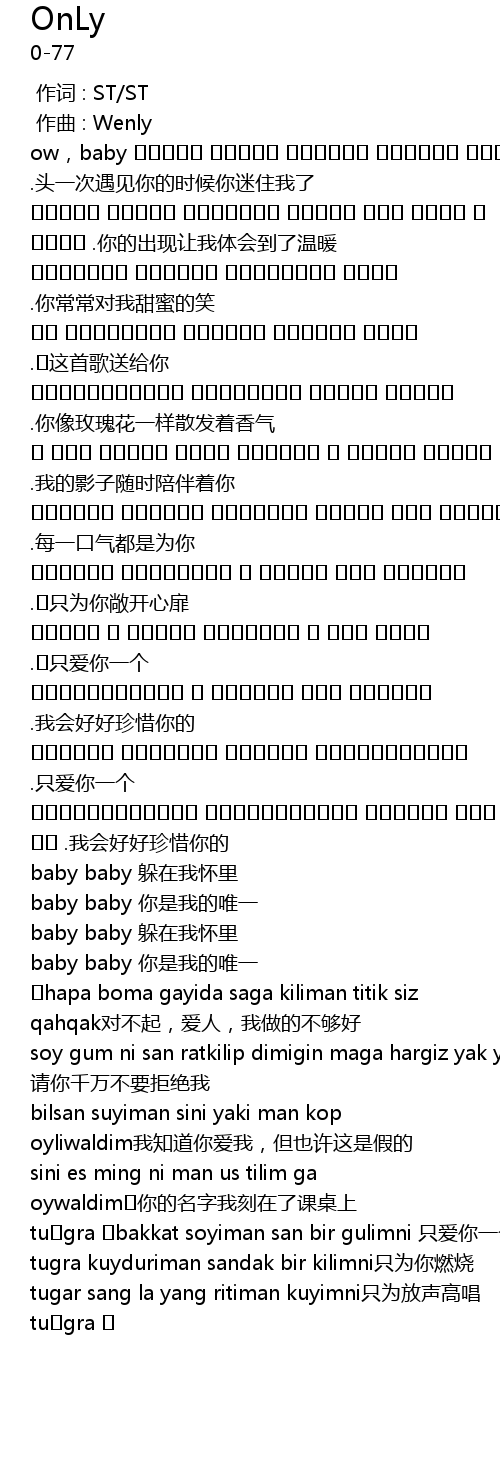| [00:44.155] | توغرا ، پەقەت سۆيىمەن ، مەن سېنى .只爱你一个 |