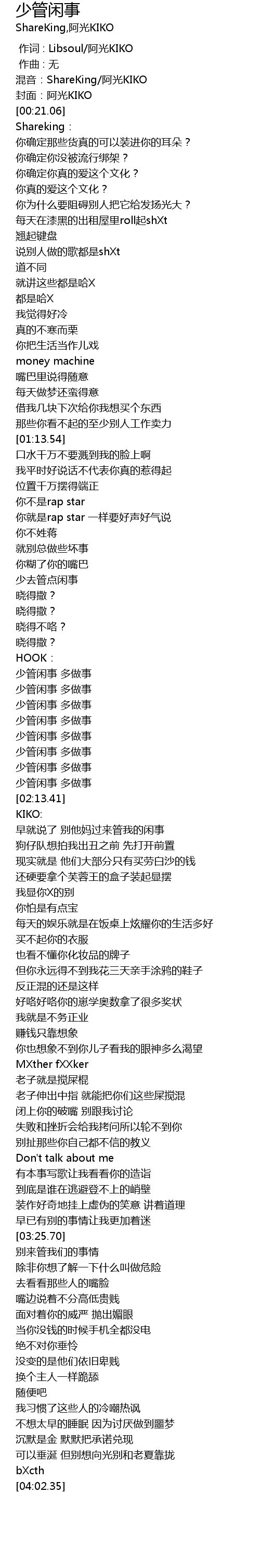 | [02:24.39] | zǎo jiù shuō le bié tā mā guò lái guǎn wǒ de xián shì |