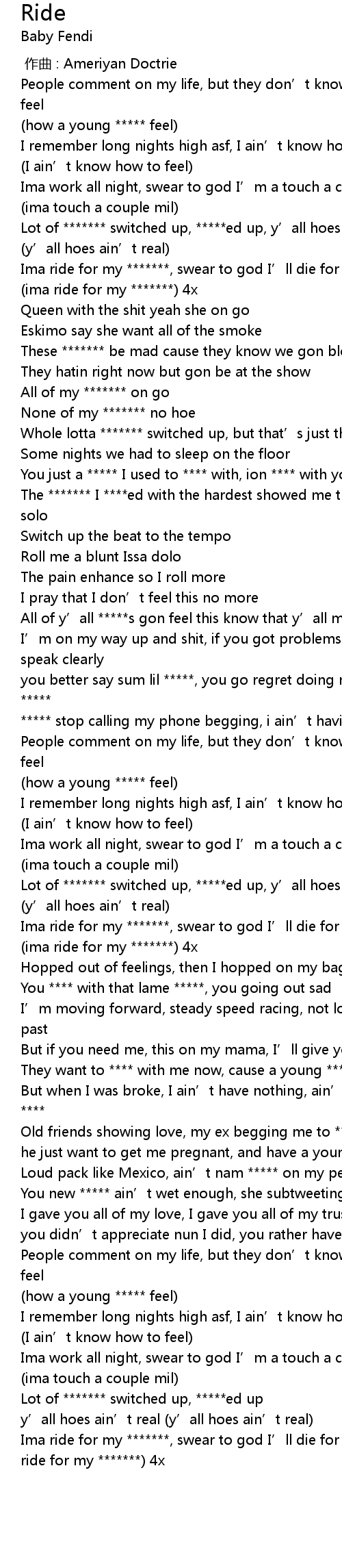 | [03:22.521] | Ima ride for my *******, swear to god I’ll die for my ******* (ima ride for my *******) 4x |