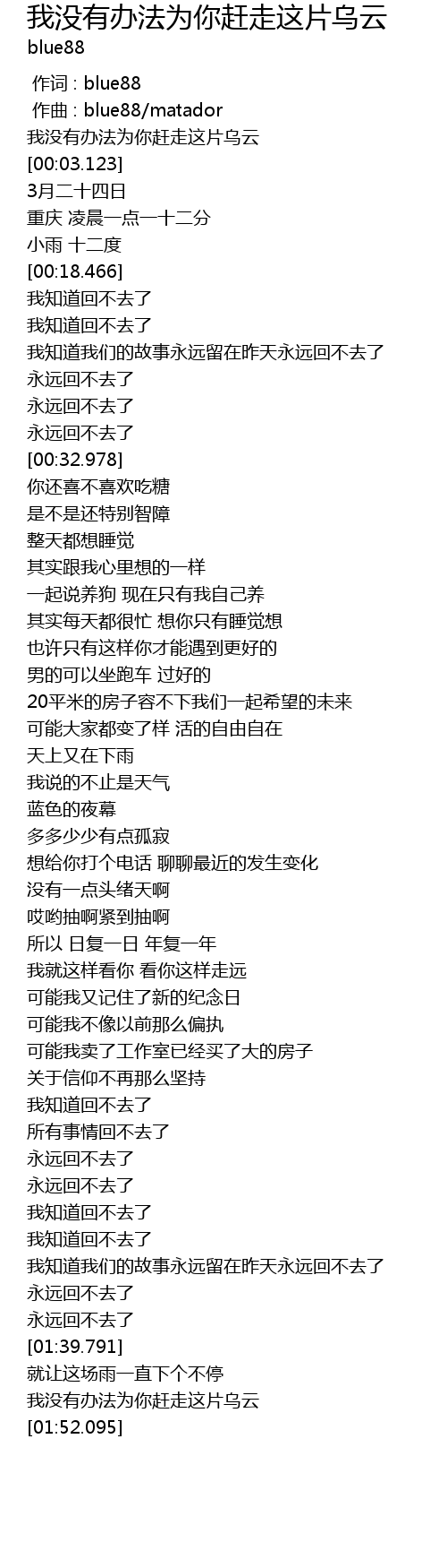 | [00:01.218] | 我没有办法为你赶走这片乌云 |