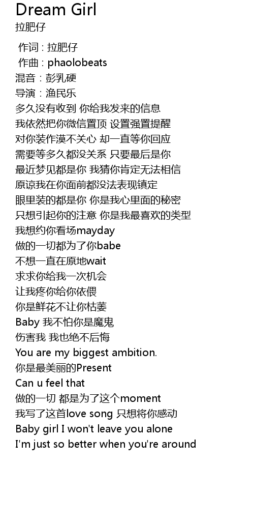 | [01:15.944] | Baby girl I won' t leave you alone |