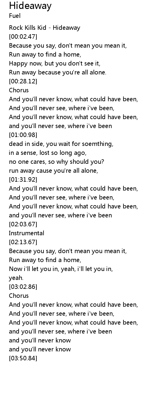 | [00:01.41] | Rock Kills Kid - Hideaway |