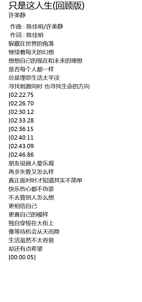 | [02:57.66][02:22.75][00:59.40] | 只是这人生本来就苦短 |