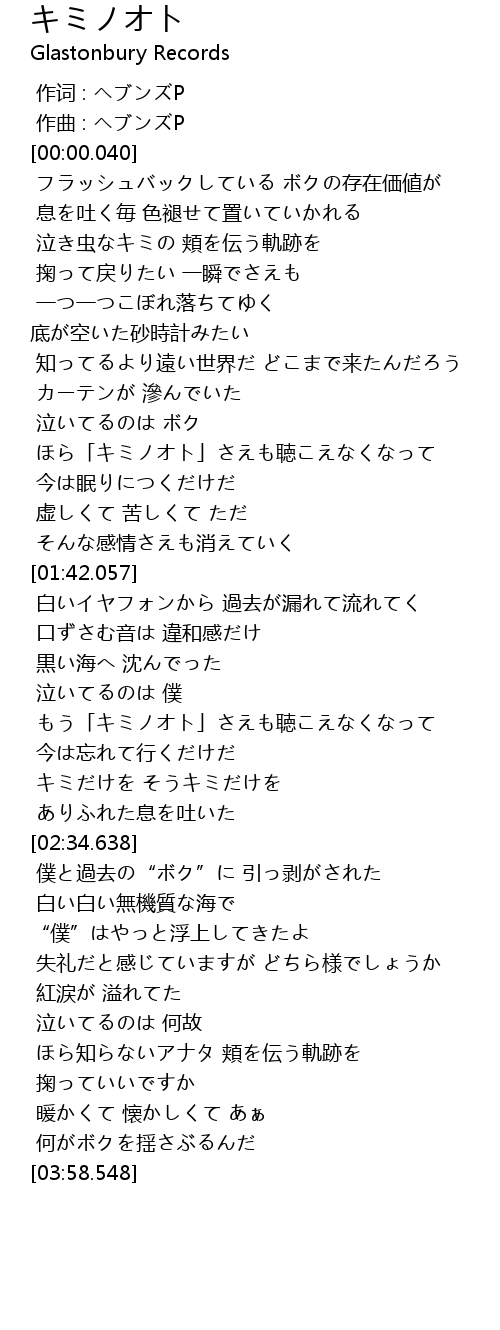 | [02:13.836] | もう「キミノオト」さえも聴こえなくなって |