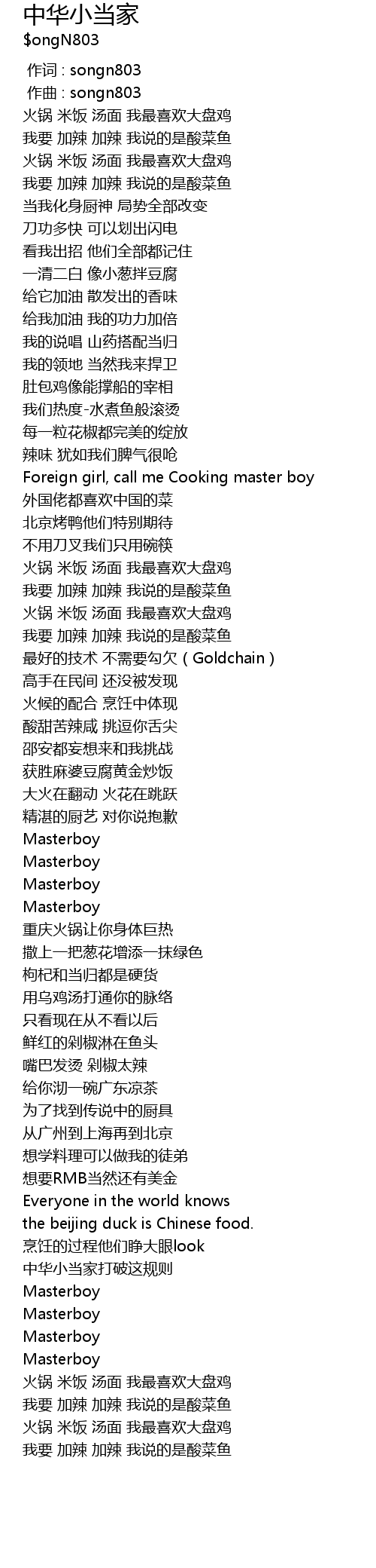 | [00:15.903] | huǒ guō mǐ fàn tāng miàn wǒ zuì xǐ huān dà pán jī |