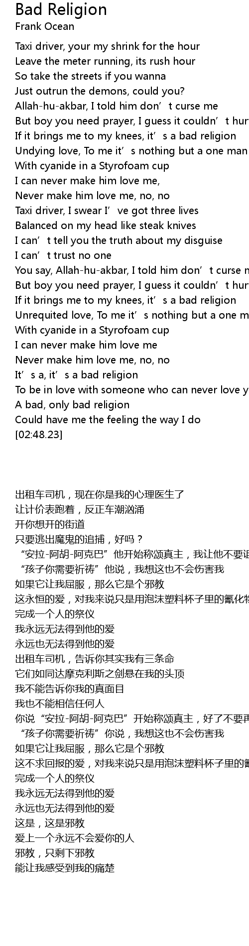 | [00:45.87] | If it brings me to my knees, it’s a bad religion |