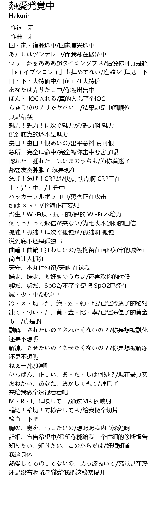 | [00:47.707] | hū zhǒng wèi nǐ zháo mí le dōu yào fā yán zhǒng zhàng le jiù shì xiàn zài |