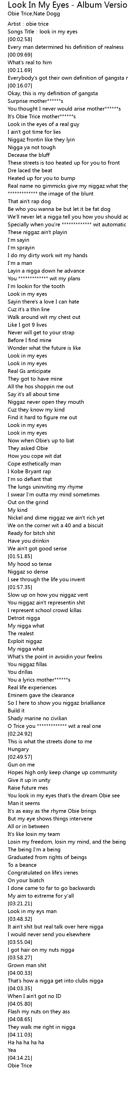 | [00:26.89] | It's Obie Trice mother******s |