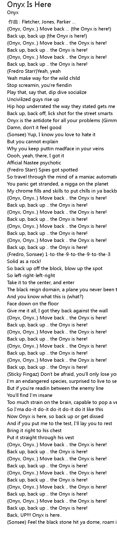 | [00:10.237] | Back up, back up (the Onyx is here!) |