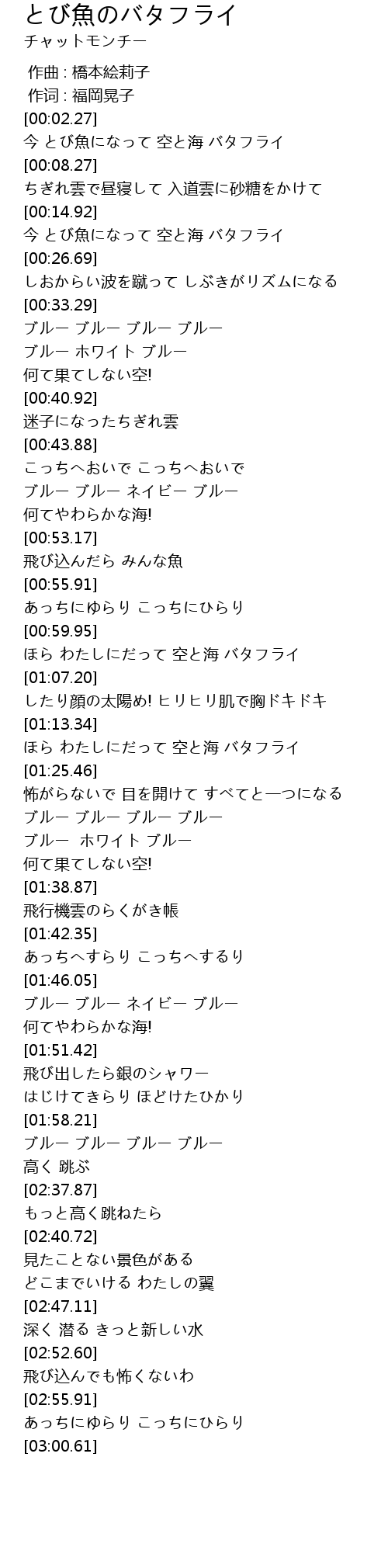 | [00:22.38] | 今 とび魚になって 空と海 バタフライ |