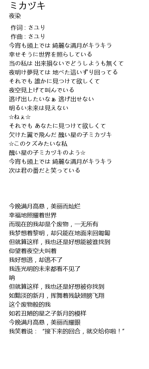 | [00:54.617] | 欠けた翼で飛んだ 醜い星の子ミカヅキ |