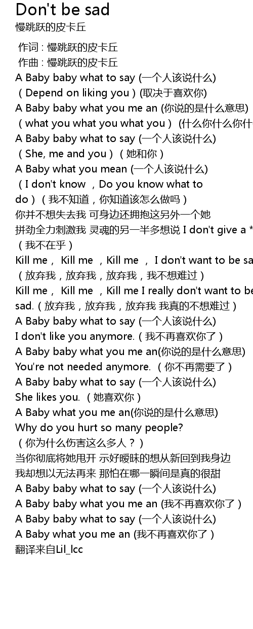 | [01:00.65] | Kill me, Kill me , Kill me I really don' t want to be sad. fàng qì wǒ, fàng qì wǒ, fàng qì wǒ wǒ zhēn de bù xiǎng nán guò |