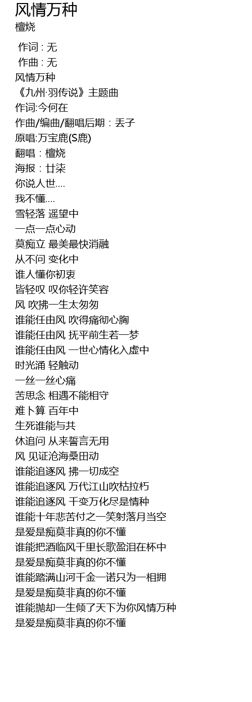 | [00:06.875] | fēng qíng wàn zhǒng |