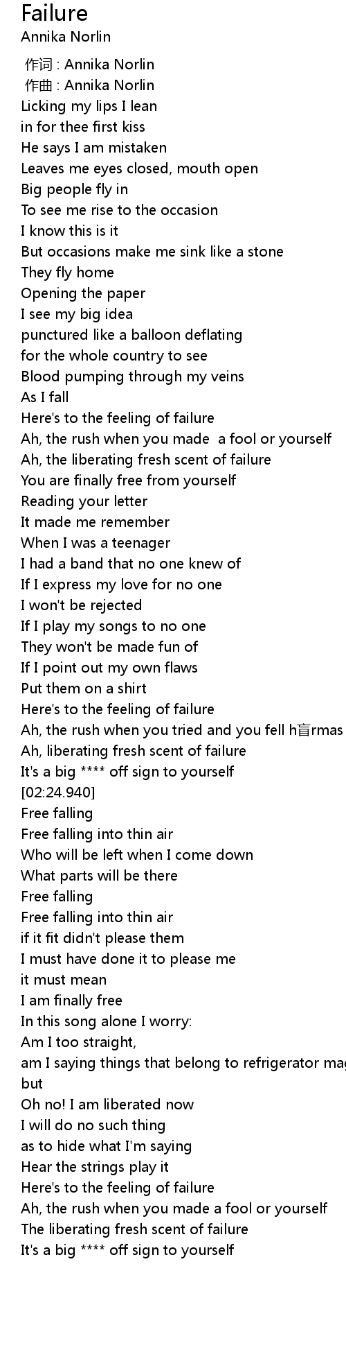 | [00:54.165] | Here's to the feeling of failure |