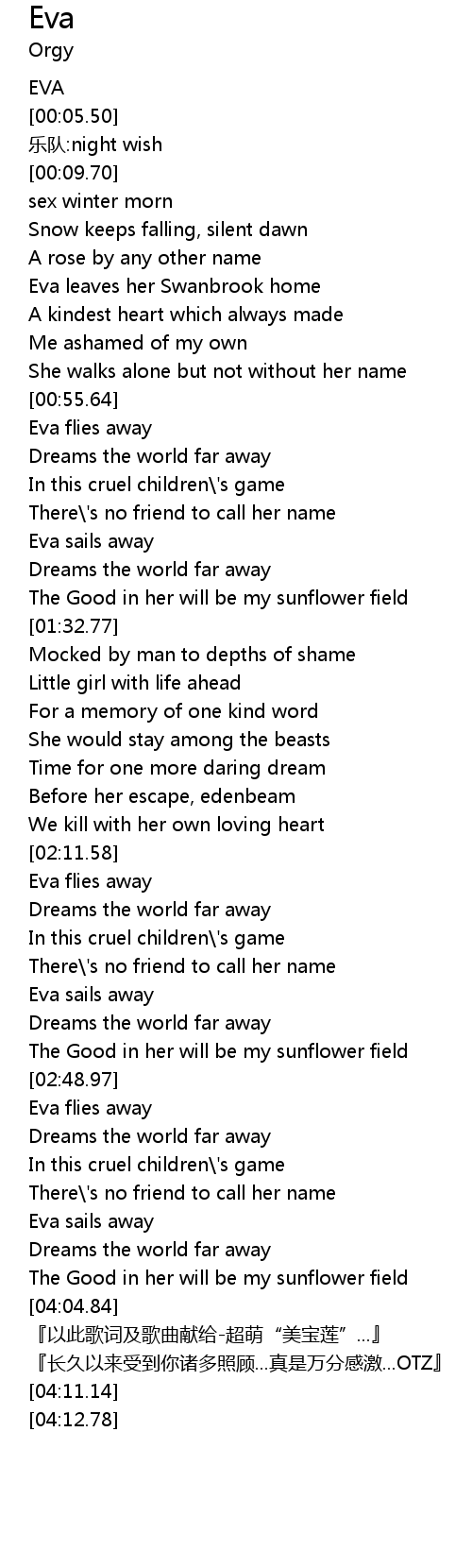 | [00:33.67] | Eva leaves her Swanbrook home |